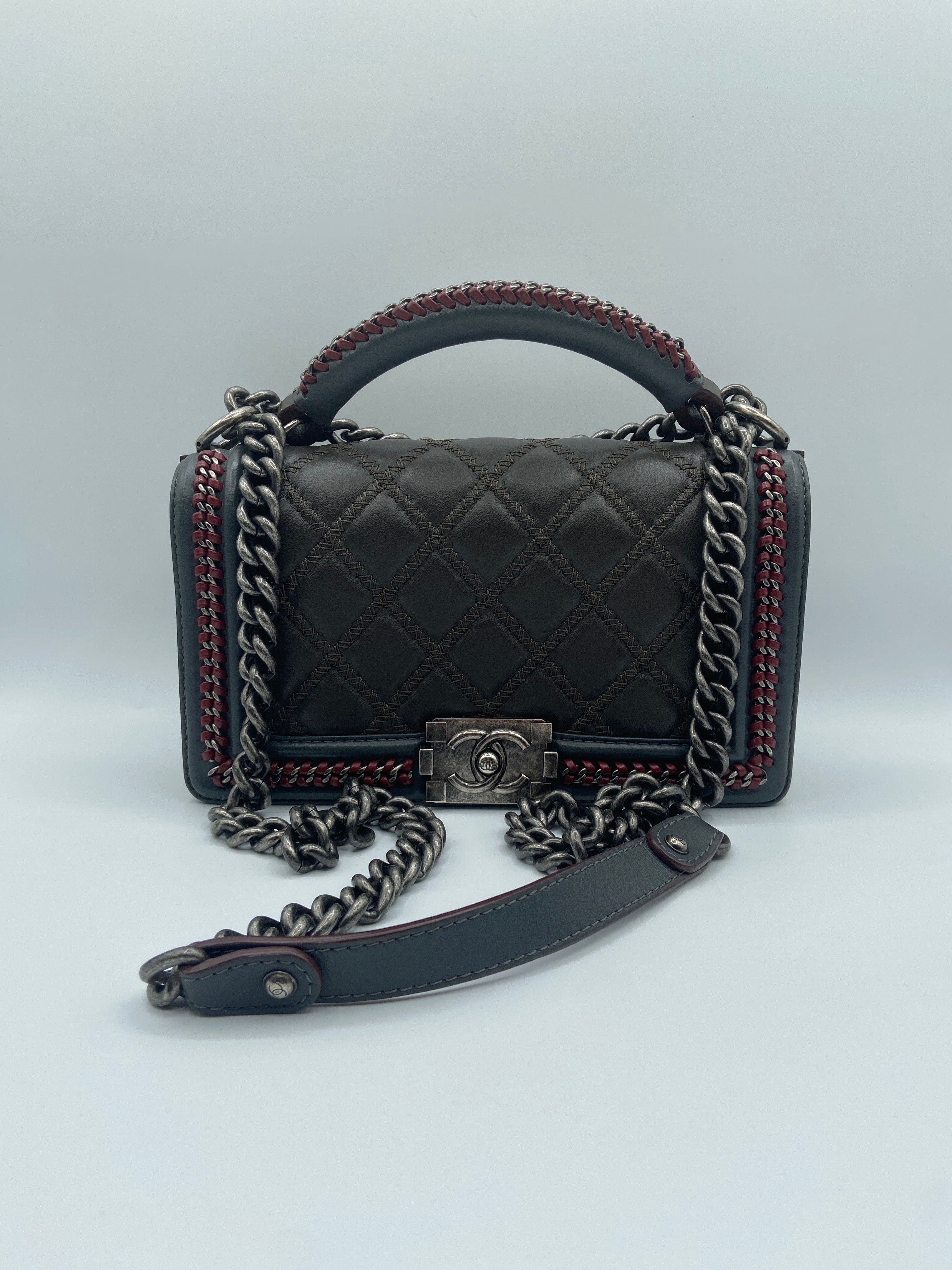 The Chanel Boy Bag is a modern icon, known for its bold lines and edgy sophistication. This version in rich red quilted calfskin leather is accented with aged gold-tone hardware, including the signature Boy CC push-lock clasp and a chunky chain strap interlaced with leather. The structured silhouette is both timeless and striking, making it a standout piece in any collection.