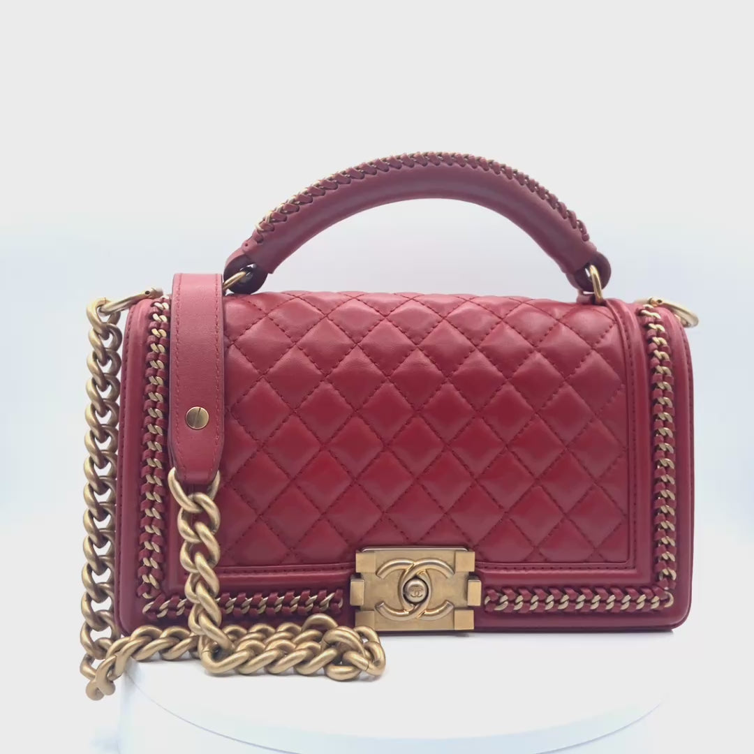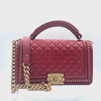 The Chanel Boy Bag is a modern icon, known for its bold lines and edgy sophistication. This version in rich red quilted calfskin leather is accented with aged gold-tone hardware, including the signature Boy CC push-lock clasp and a chunky chain strap interlaced with leather. The structured silhouette is both timeless and striking, making it a standout piece in any collection.