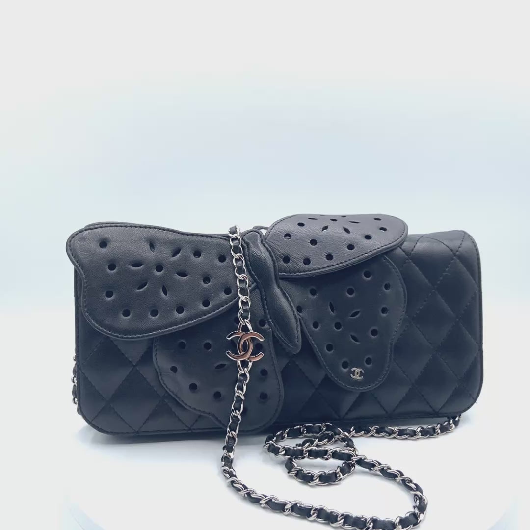 This Chanel Butterfly Flap Clutch is a standout collector piece crafted in smooth black lambskin with classic diamond quilting and an oversized perforated butterfly appliqué. The sculptural butterfly detail adds a dramatic, couture-level twist to an otherwise timeless Chanel silhouette, making this piece equal parts elegant and statement-making.