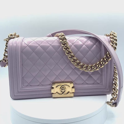 Chanel Boy Bag in Lilac Quilted Patent Leather with Gold-Tone Chain Strap