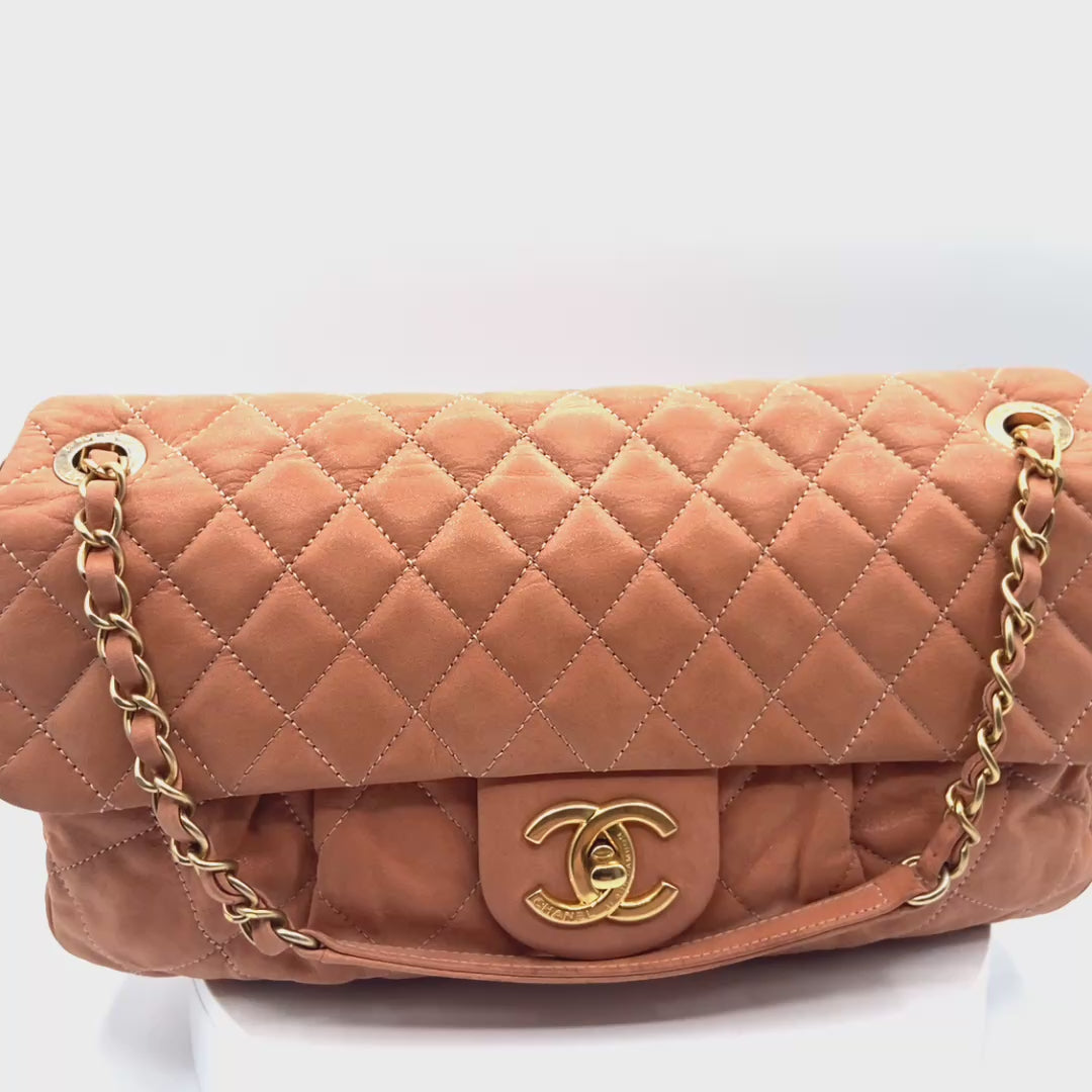 Designed with a structured flap silhouette and a generously sized interior, this bag transitions seamlessly from day to evening. The suede exterior adds a luxurious texture that elevates the classic flap beyond the standard leather versions. Condition is excellent, with the quilted structure and hardware presenting beautifully.